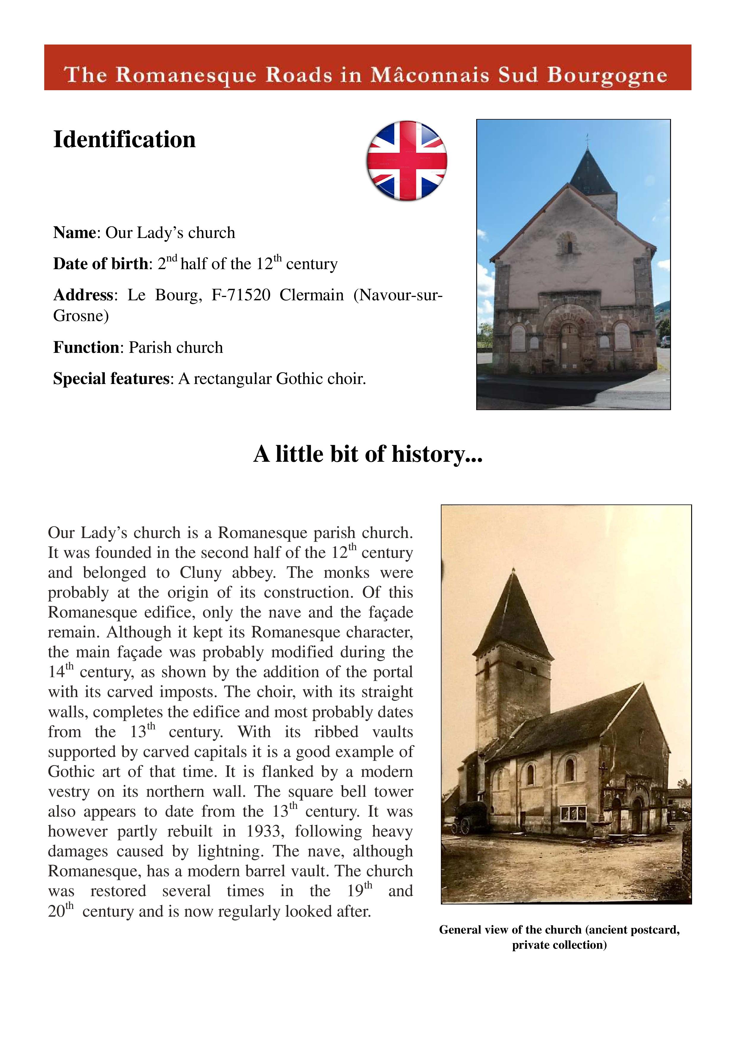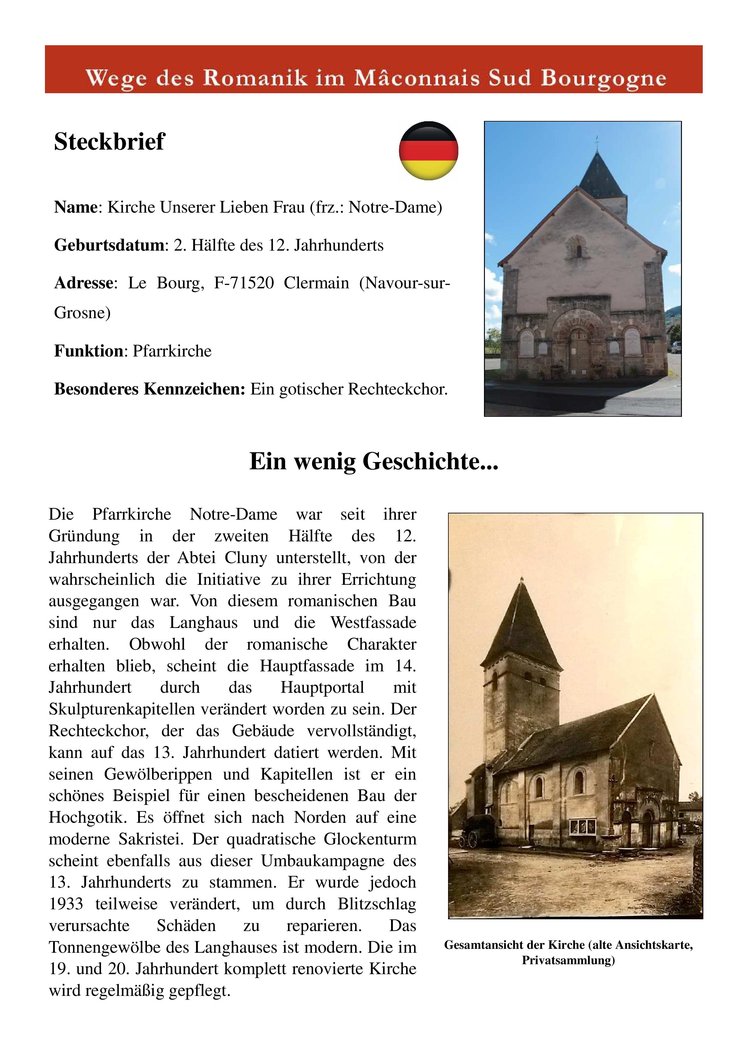 L’église paroissiale Notre-Dame est située à Clermain (Navour-sur-Grosne), dans le département de la Saône-et-Loire, en Bourgogne-Franche-Comté. Elle dépendait à sa fondation dans la seconde moitié du XIIe siècle de l’abbaye de Cluny, qui est probablement à l’origine de sa construction. De cet édifice roman, seules la nef et la façade demeurent. Bien qu’elle ait gardé sa physionomie romane, la façade principale paraît avoir été remaniée au XIVe siècle par l’ajout du portail principal avec impostes sculptées. Le chœur à chevet droit qui complète l’édifice daterait plutôt du XIIIe siècle. Il offre un bel exemple de l’art gothique à cette époque, notamment grâce aux nervures de ses voûtes qui retombent sur des chapiteaux sculptés. Il s’ouvre au nord sur une sacristie moderne. Le clocher carré semble également dater de la reconstruction du XIIIe siècle. Il a cependant été partiellement reconstruit en 1933, afin de réparer les dégâts causés par la foudre. La voûte en berceau de la nef est, pour sa part, moderne. L’église a été entièrement rénovée aux XIXe et XXe siècles et est régulièrement entretenue.